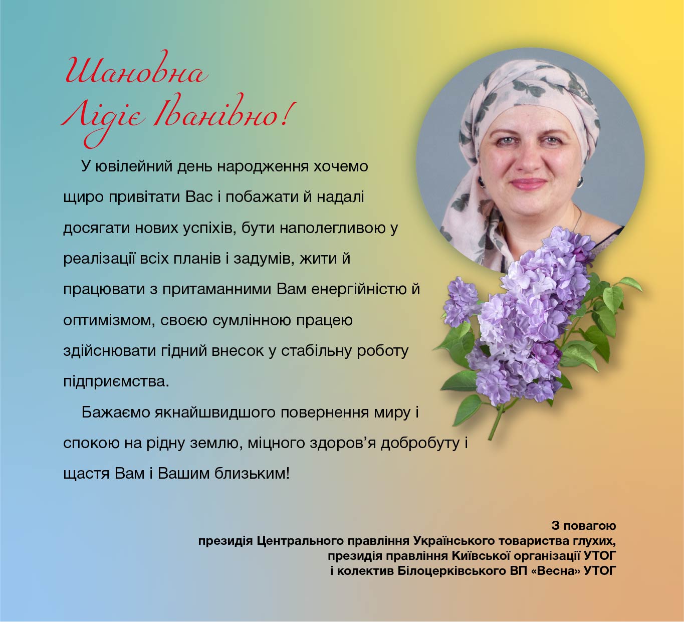 Сьогодні відзначає ювілейний день народження заступниця директора з навчально-виховної роботи та соціальних питань Білоцерківського виробничого підприємства «Весна» УТОГ Лідія Іванівна ОСТАПЧУК
