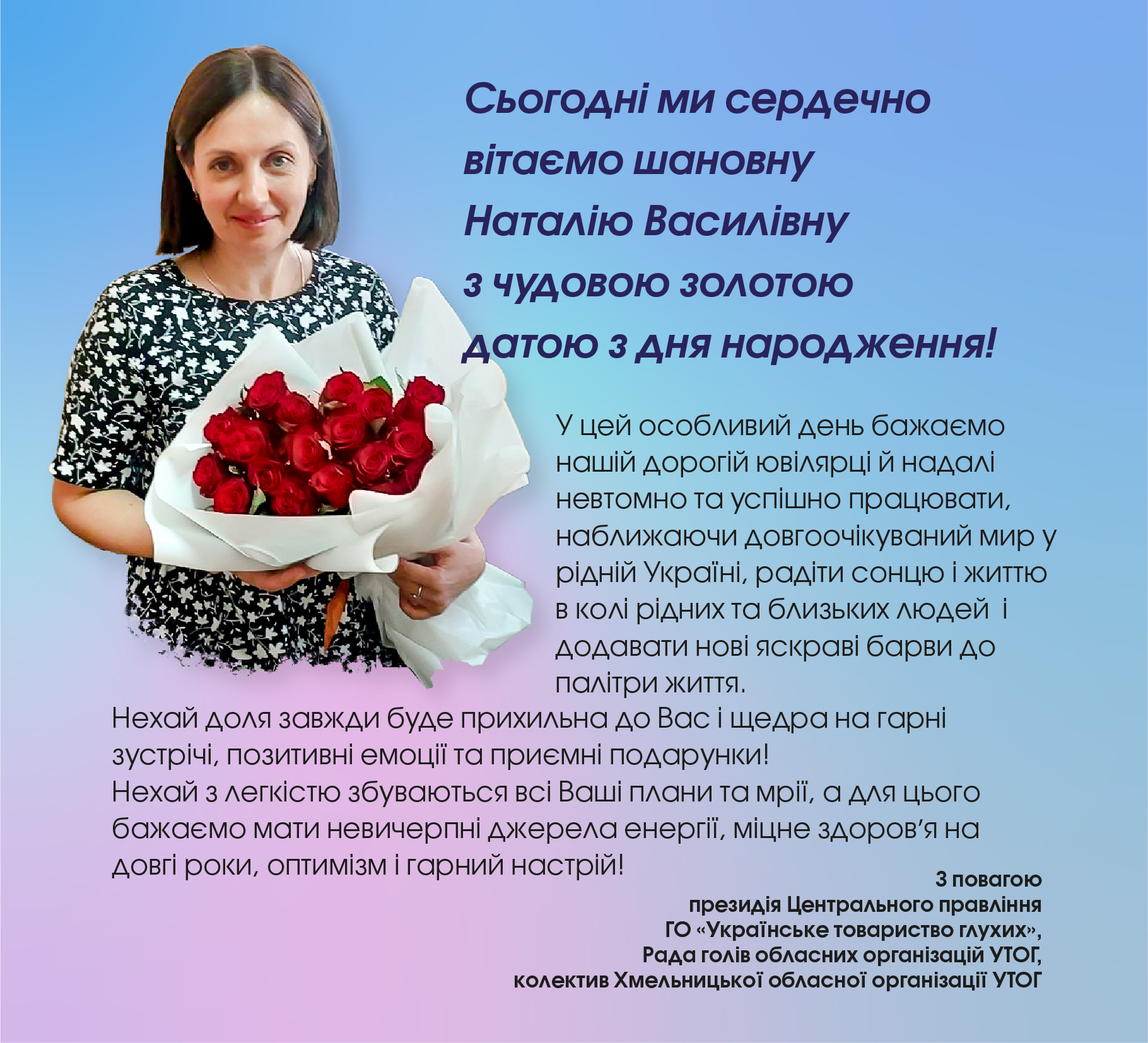 Цього чудового травневого недільного дня відзначає золотий ювілей Наталія Василівна НІКОЛЕНКО, яка вже два роки виконує обов'язки голови Хмельницької обласної організації УТОГ. У цій важливій справі надання всебічної допомоги глухим вона не нова людина, адже в нашій організації працює вже понад 15 років.