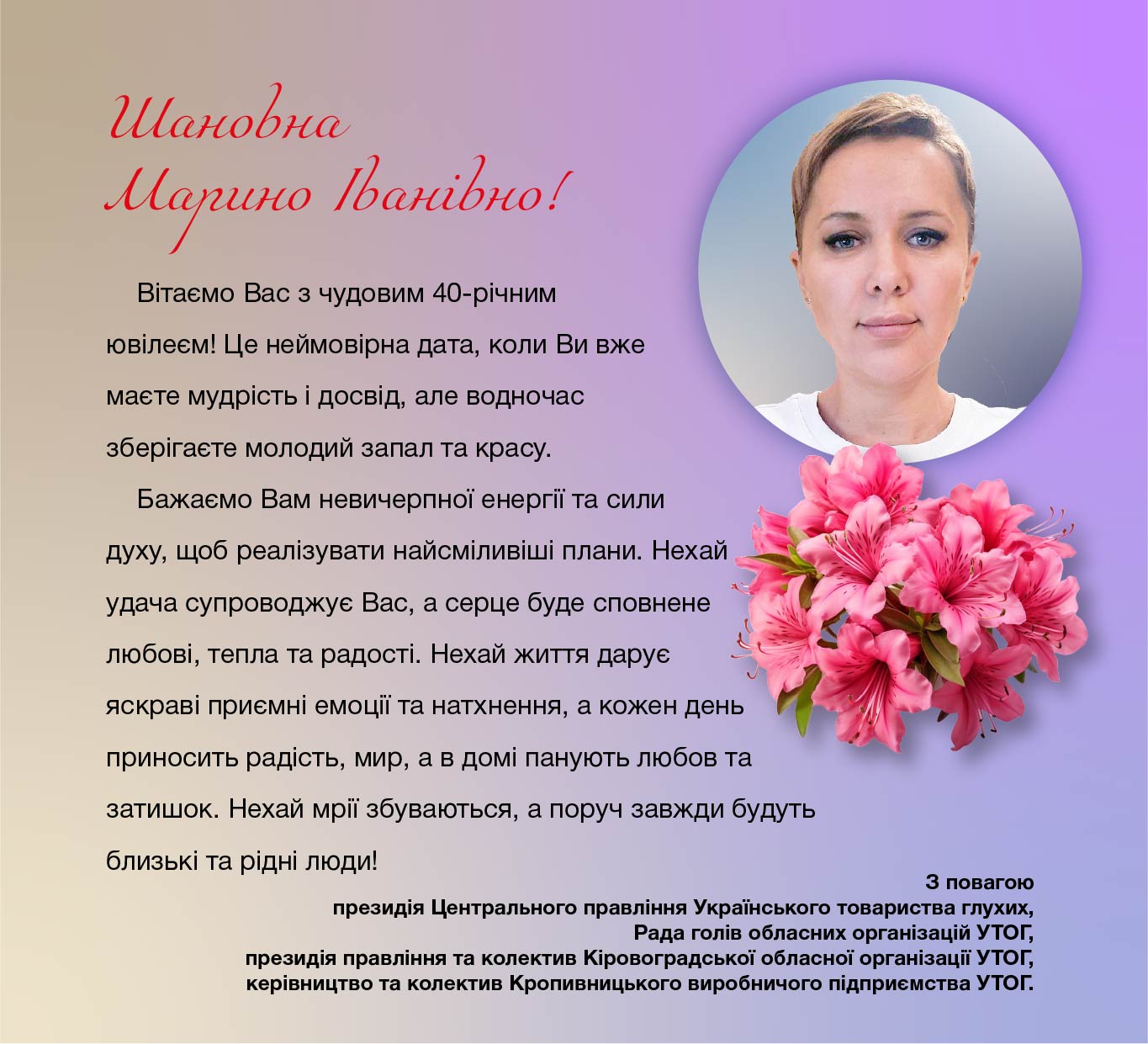 Голова Кіровоградської обласної організації УТОГ Марина Іванівна МАЙСТРЕНКО, яка відзначає сьогодні ювілейну дату, попри свій молодий вік, має вже чималий успішний досвід роботи на керівній посаді й користується заслуженою повагою своїх колег, які обрали її головою Ради голів обласних організацій УТОГ