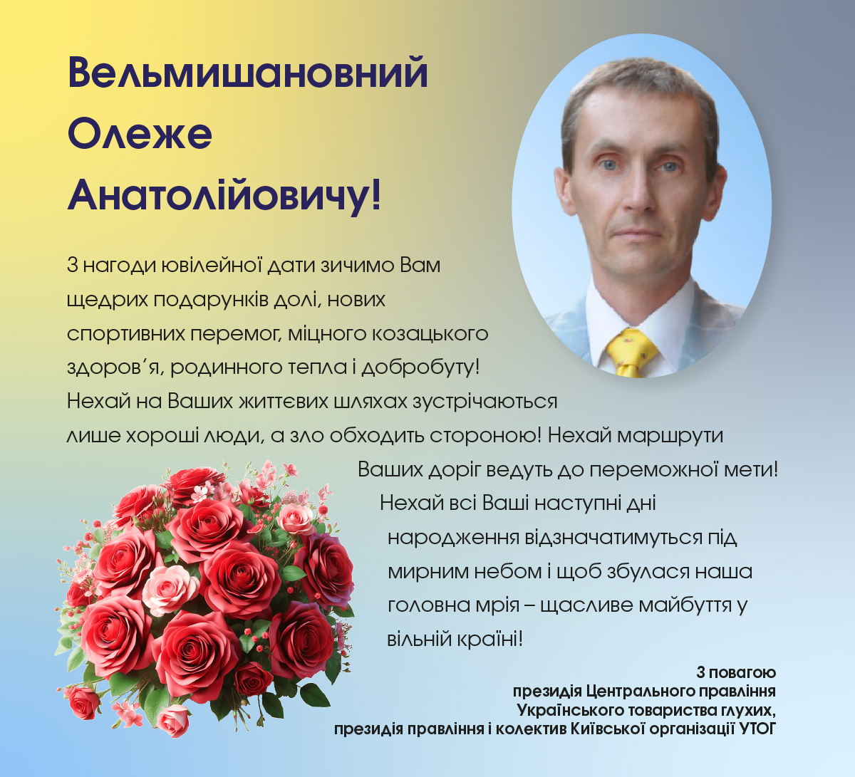 Сьогодні відзначає ювілейний день народження Перший віцепрезидент Спортивної федерації глухих України Олег Анатолійович ЛАВРИК, який відомий не лише своїми визначними спортивними досягненнями, а й активною життєвою позицією та участю у діяльності УТОГ, любов’ю і до нашої національної мови та культури, й до мови та культури глухих.