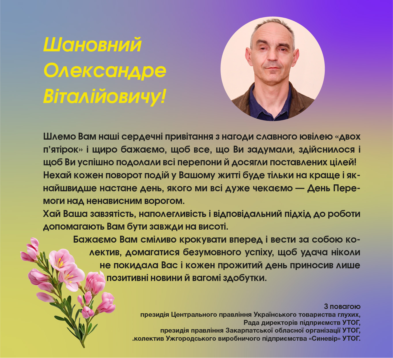 Директор Ужгородського виробничого підприємства «Синевір» УТОГ Олександр Віталійович ГУДЗИНСЬКИЙ 28 серпня відзначає 55-річний ювілей