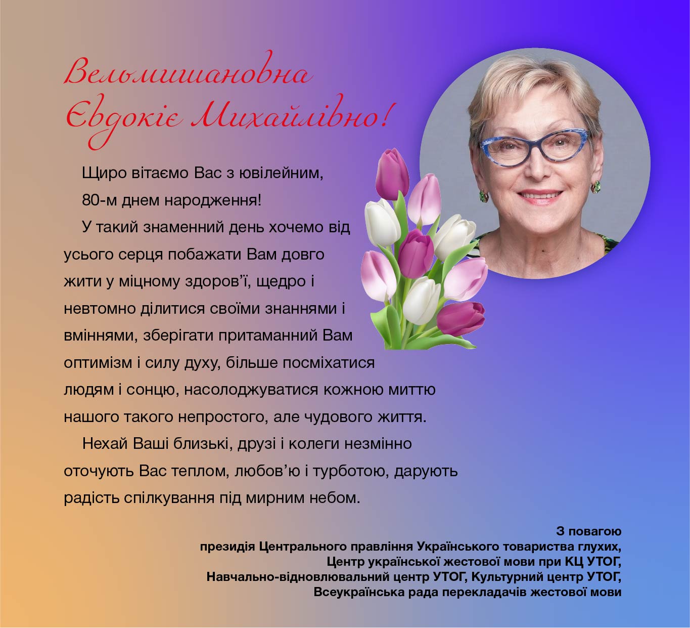 У її трудовій біографії, яка з 1965 року тісно пов'язана з УТОГ, найчастіше поруч з професією перекладачки згадується ще й досвід викладання жестової мови. Безумовно, той, хто навчає, сам є взірцем у професії. Таким взірцем для не одного покоління перекладачів жестової мови є Євдокія Михайлівна ЗУЄВА, яка 6 березня відзначає поважну ювілейну дату, в яку, відверто кажучи, вона й сама не вірить: "Невже це мені вже стільки років?"