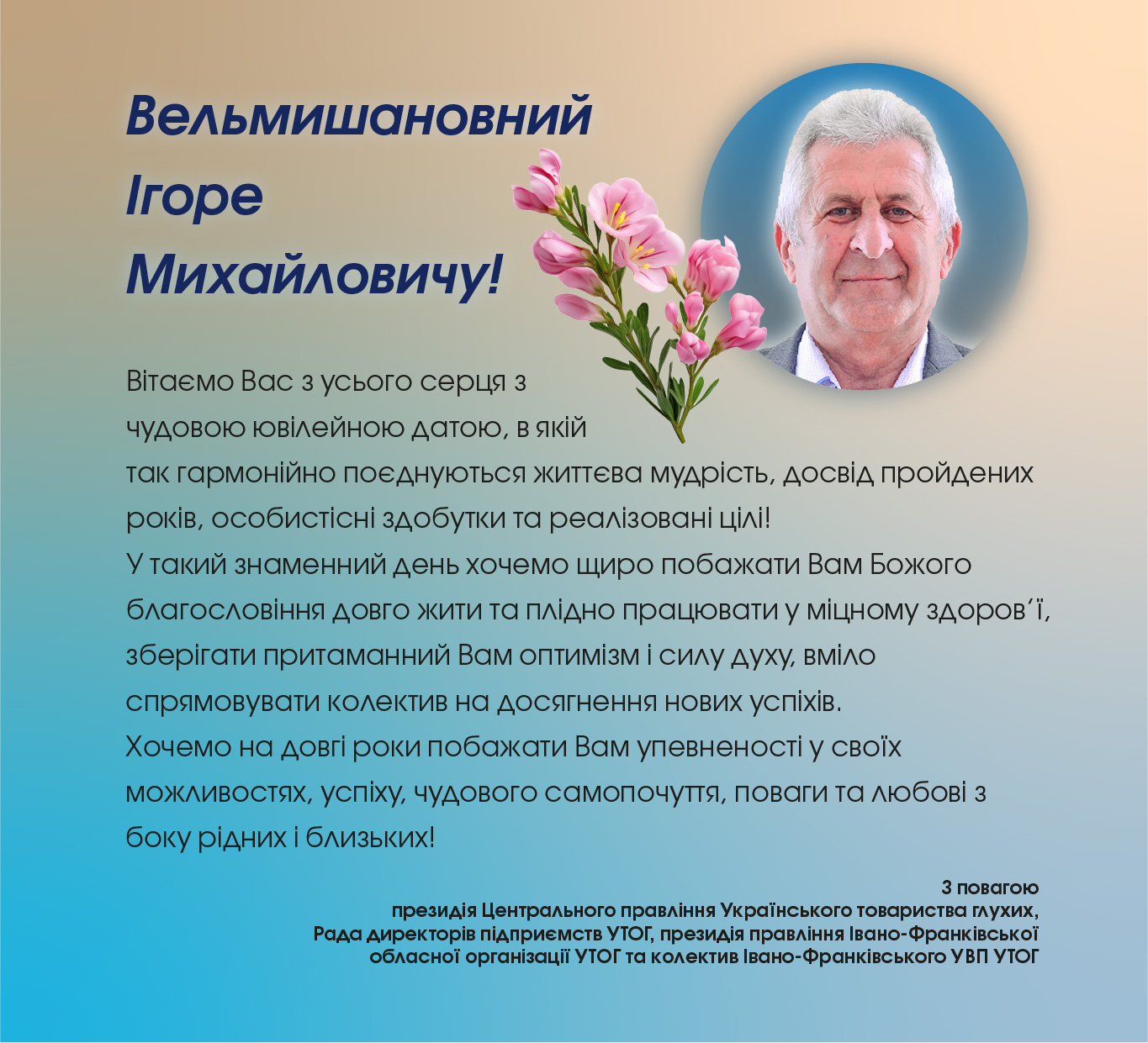 Сьогодні, 19 листопада поважну ювілейну дату відзначає директора Івано-Франківського підприємства ГО «УТОГ» Ігор Михайлович ОСТЯК. Колеги і друзі щиро вітають ювіляра, з пошаною і подякою відзначають його плідну працю на благо Товариства і шлють також поздоровлення з високою нагородою - другою відзнакою УТОГ «За заслуги».