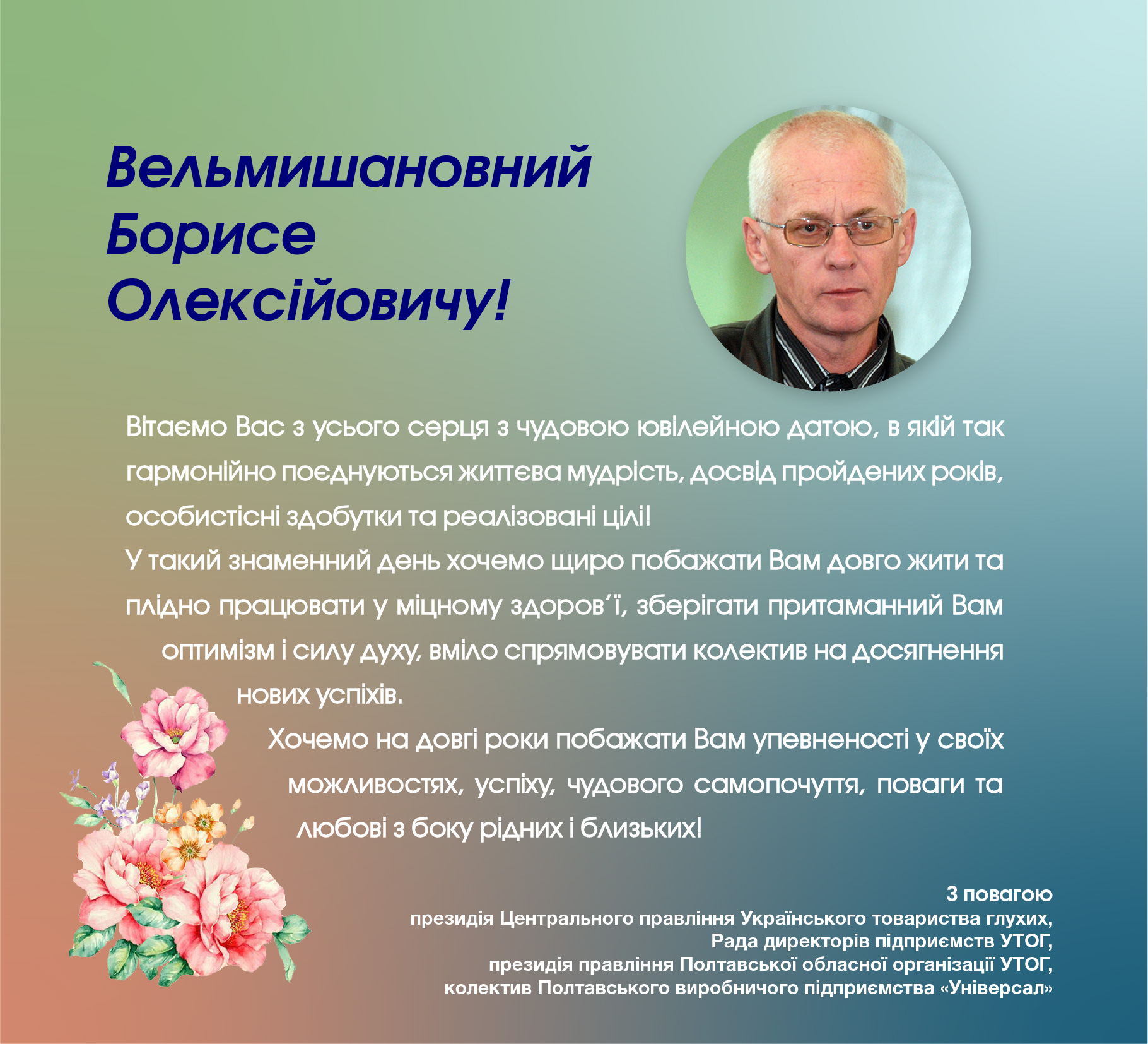 Поважну ювілейну дату 9 серпня відзначає директор Полтавського виробничого підприємства «Універсал» Українського товариства глухих Борис Олексійович AКIНІН. Колеги і друзі щиро вітають ювіляра, з пошаною і подякою відзначають його плідну працю на благо Товариства.