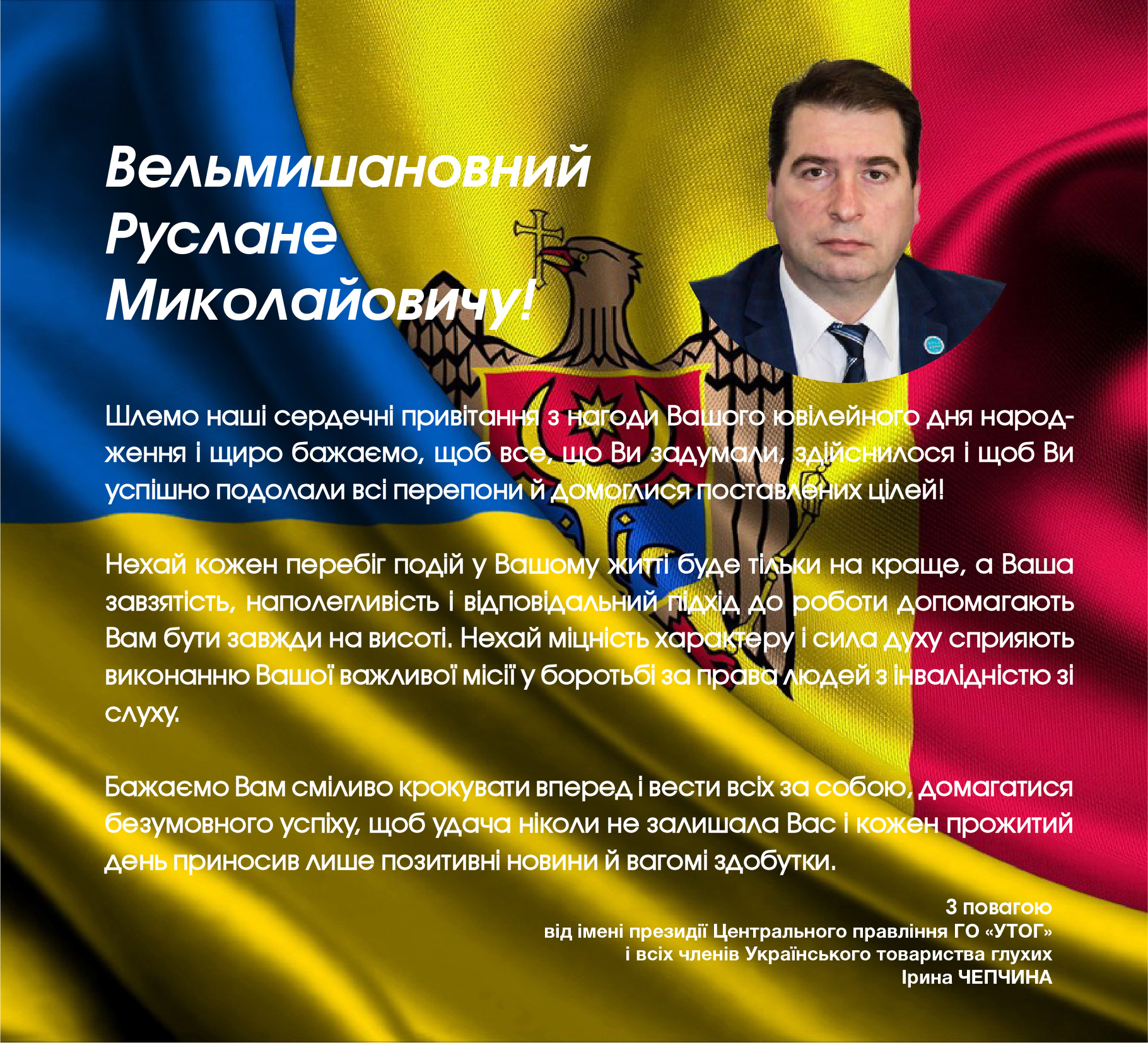 Така урочиста подія є чудовою нагодою гідно відзначити Вас й щиро подякувати за Вашу сумлінну багаторічну працю на посаді Президента Товариства глухих Республіки Молдова, а також під час очолювання Вами роботи Регіонального Секретаріату товариств глухих Східної Європи та Середньої Азії. Багаторічна співпраця цих керованих Вами важливих інституцій з Українським товариством глухих має чимало яскравих сторінок, які свідчать про наполегливу боротьбу за права і свободи глухих людей, за зміну ставлення до розуміння поняття інвалідності, розвиток жестової мови та культури глухих.