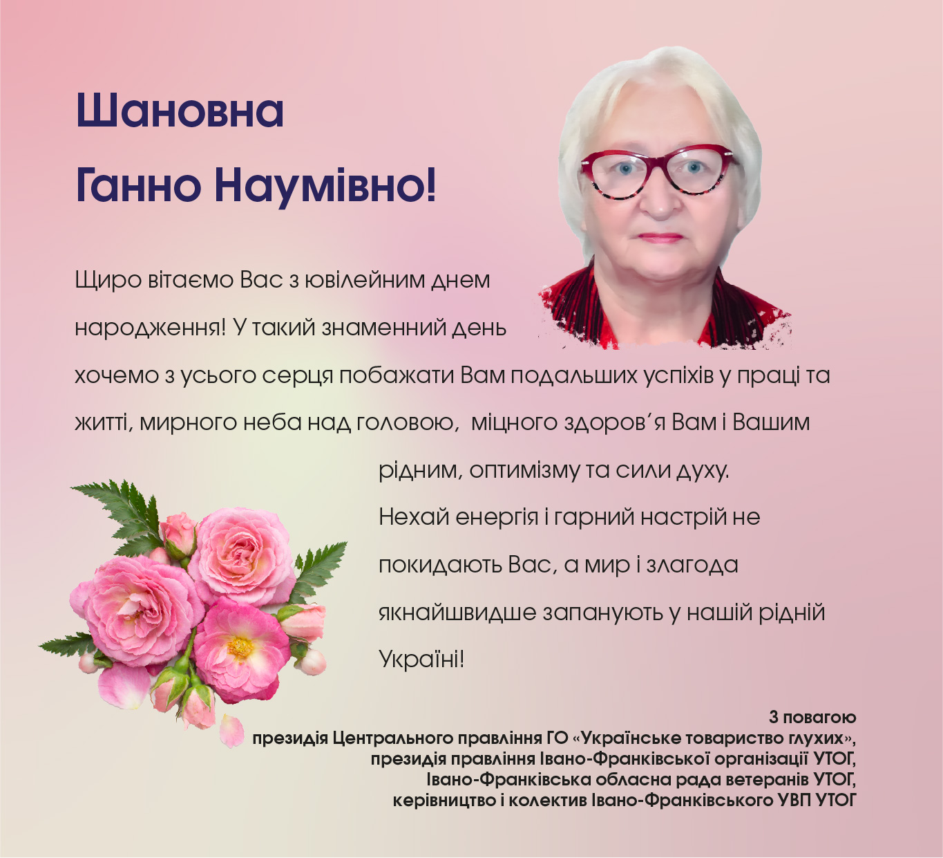Чимало в Українському товаристві глухих трудівників, які за сумлінну багаторічну працю мають велику шану та повагу і у своєму трудовому колективі, і далеко за його межами. У прославленому своїми здобутками Івано-Франківському УВП УТОГ це Ганна Наумівна ВІНТОНЯК, яка 9 лютого відзначає ювілейну дату з дня народження.