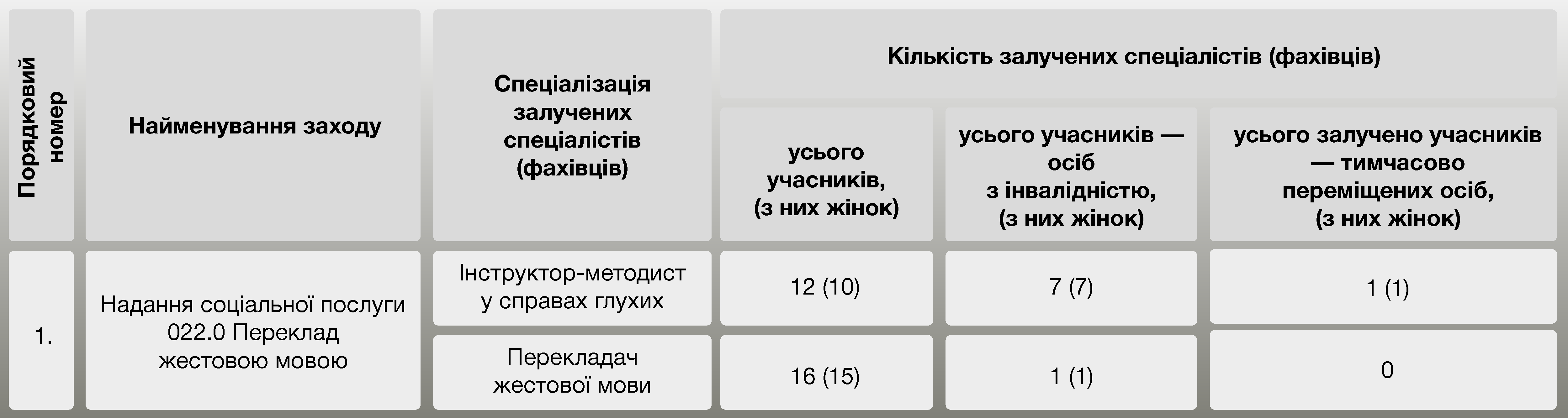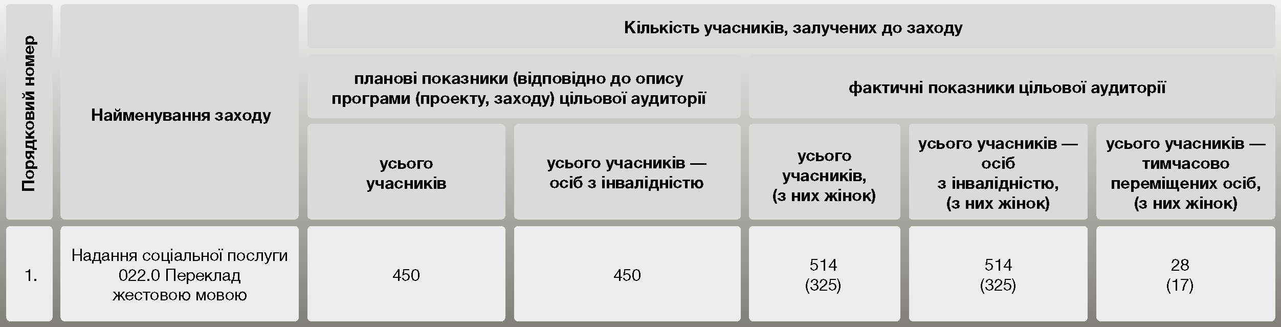 | 1 | Виявлення та залучення до участі у проєкті отримувачів соціальної послуги перекладу жестовою мовою. | Інформування про реалізацію проєкту та можливість отримання соціальної послуги перекладу жестовою мовою за рахунок коштів проєкту. Організація надання допомоги у отриманні ними рішення УСЗН про надання соціальної послуги перекладу жестовою мовою. | Проведено інформування про реалізацію проєкту, в т.ч. силами обласних організацій УТОГ та їх структурних підрозділів, на території областей, де здійснювалася реалізація проєкту. |