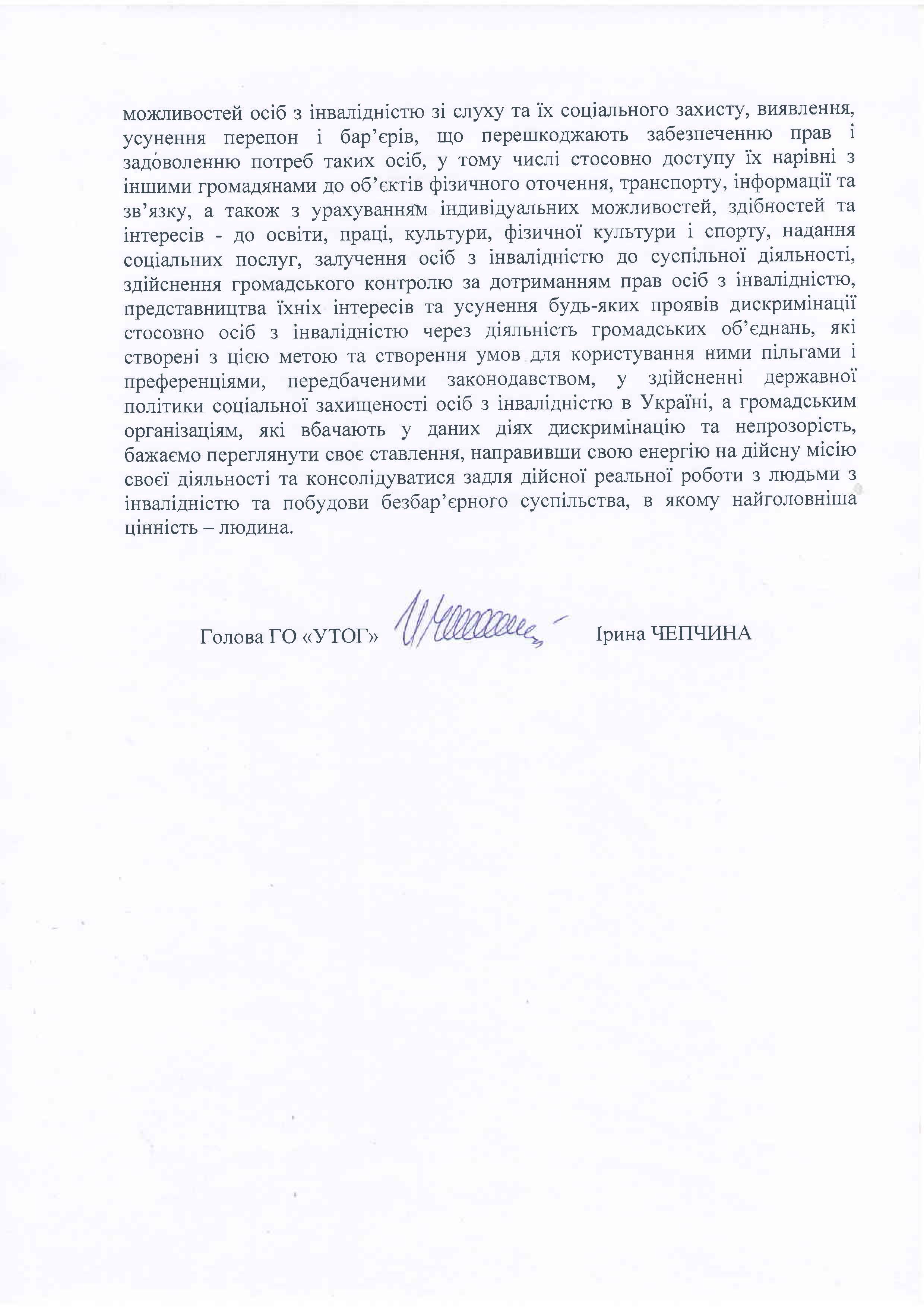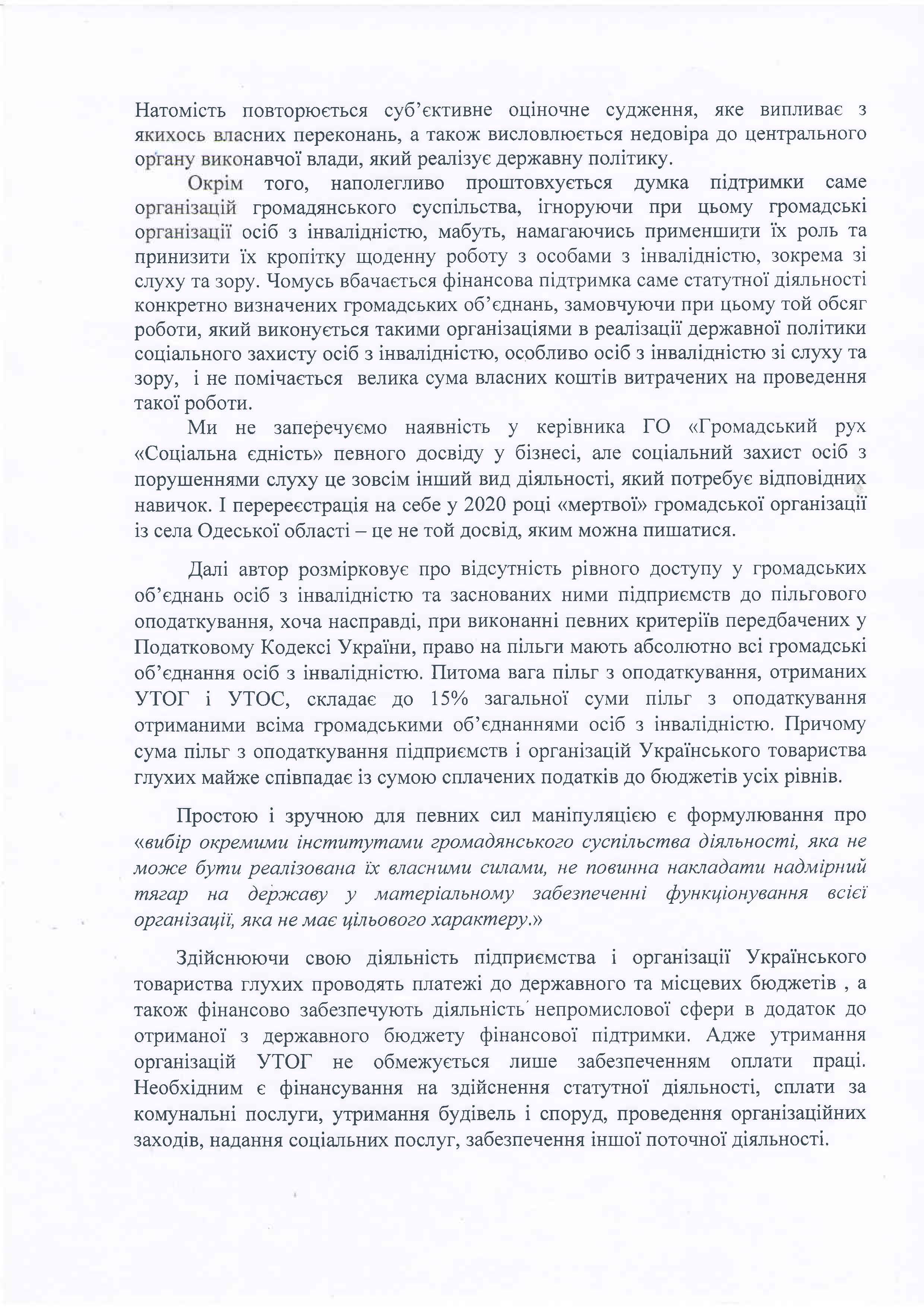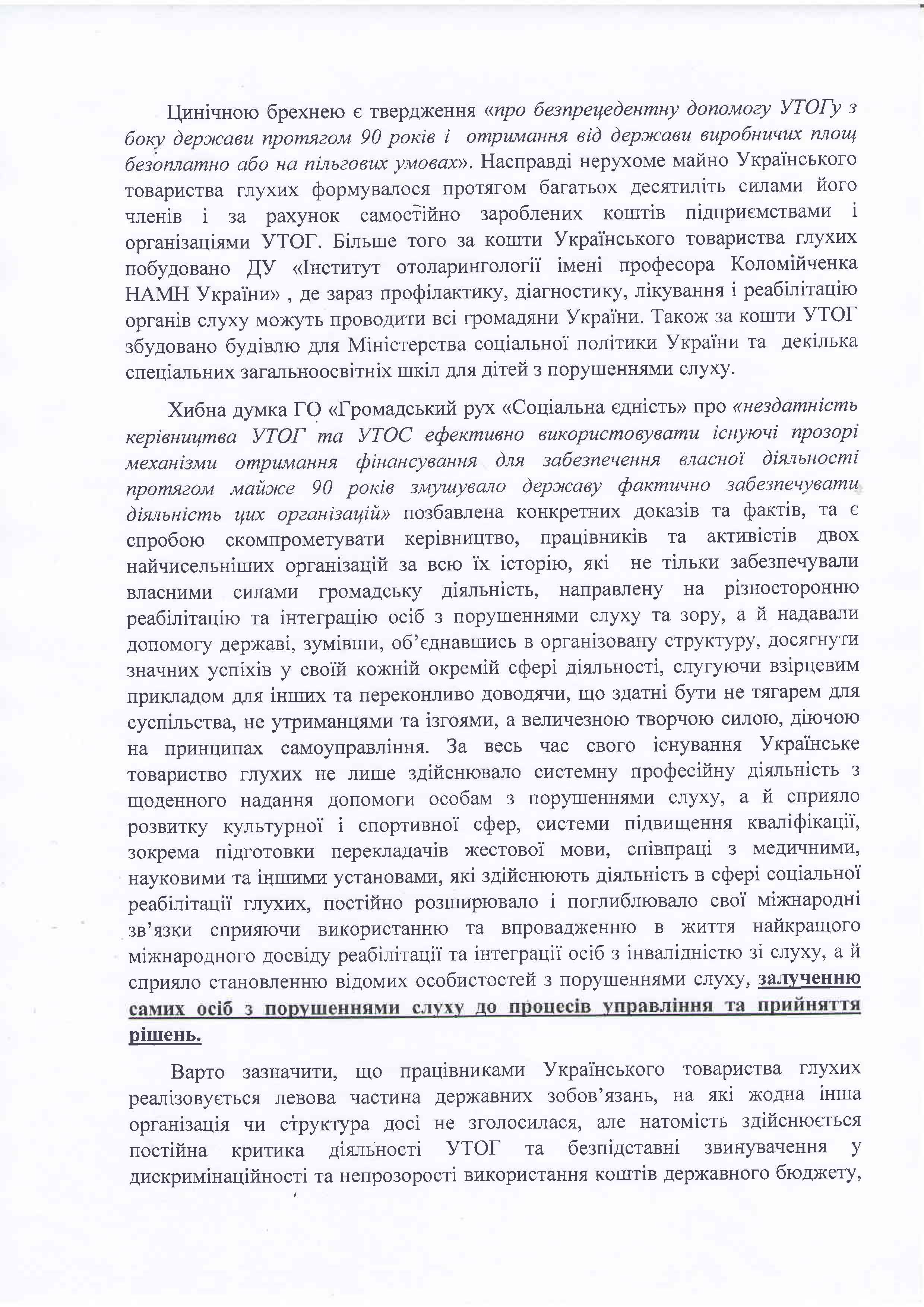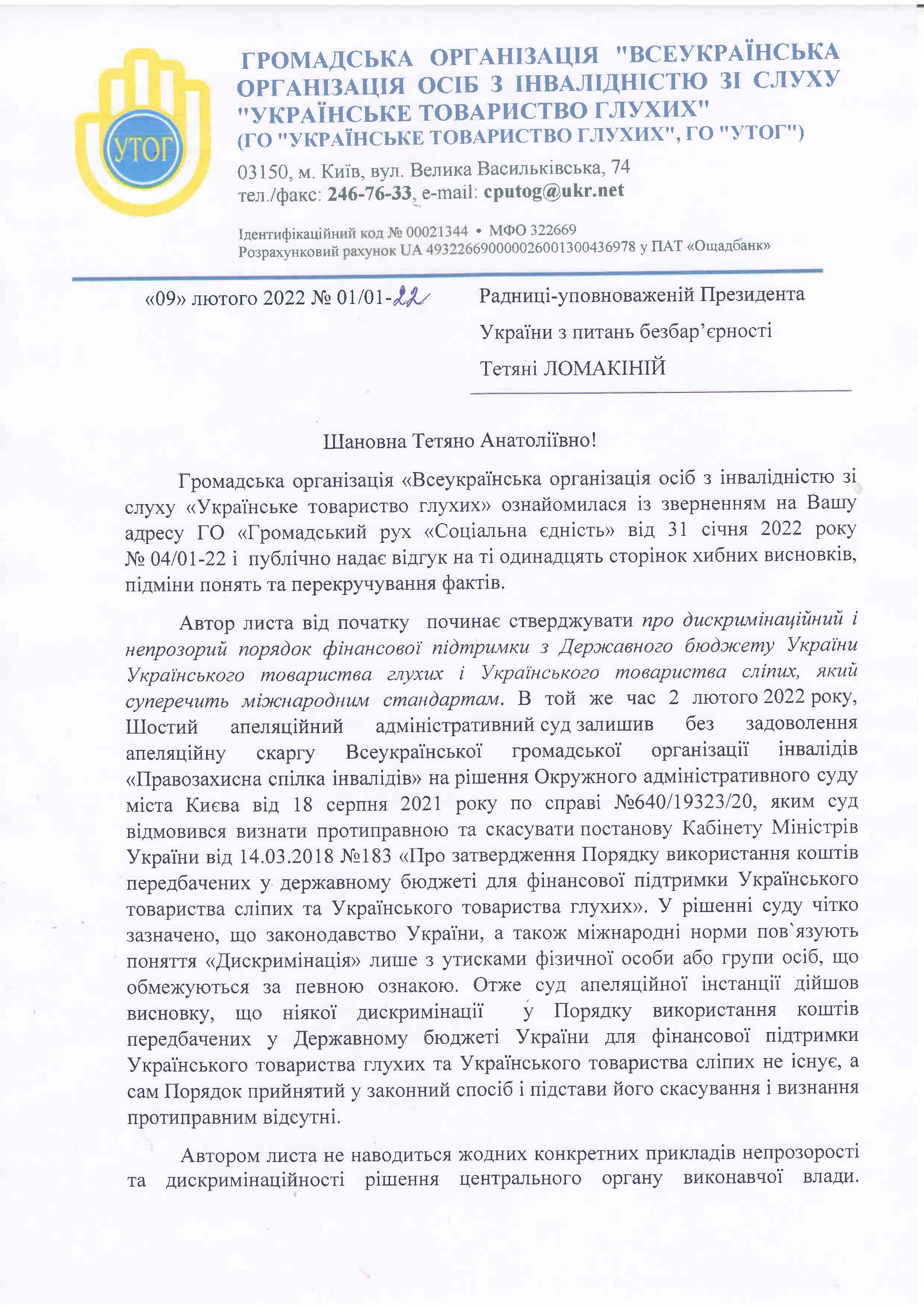 Відповідь УТОГ на звернення ГО «Громадський рух «Соціальна єдність»